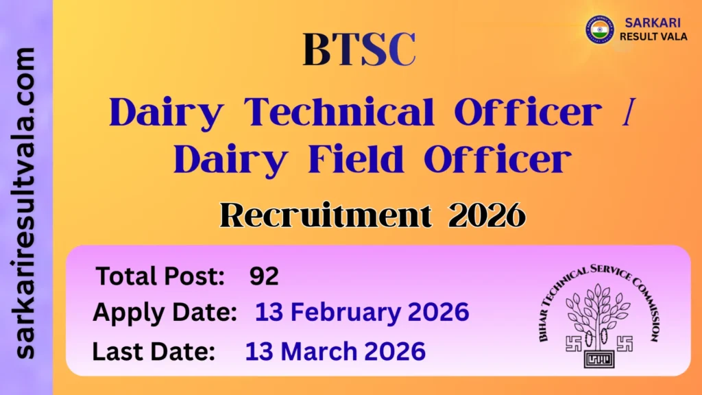 Short Information BTSC (Bihar Technical Service Commission) has released a new notification for Dairy Technical Officer / Dairy Field Officer Recruitment 2026. BTSC Dairy Field Officer vacancy 2026 total post 92. The online application process for Bihar Technical Service Commission Dairy Technical Officer 2026 will begin on 13 February 2026 and continue until 13 March 2026 through the official BTSC website. Candidates read the full notification before the apply Bihar Dairy Technical Officer / Dairy Field Officer 2026 Vacancy. Eligible candidates can apply online for the BTSC all Post. All important details such as eligibility criteria, application process, and Bihar DTO / DFO online registration link are provided below.