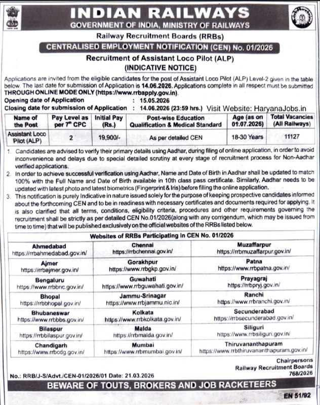 RRB [ Railway Recruitment Board ] has released a short notification for the recruitment of Assistant Loco Pilot (ALP) posts on its official website. This recruitment is for approx 11,127 posts. The online application process for the Railway RRB ALP Vacancy 2026 [ 11,127 Posts ], through the official Railway RRB ALP website. The Minimum age limit is 18 years, and the maximum age limit is 30 years as of 01 July 2026. Candidates, check the full notification Details for the Railway RRB ALP vacancy 2026 [ 11,127 Posts ]. Railway RRB ALP Vacancy 2026 Application Form will start from 15 May 2026, and the candidates can apply till 14 June 2026. Details links are provided below.